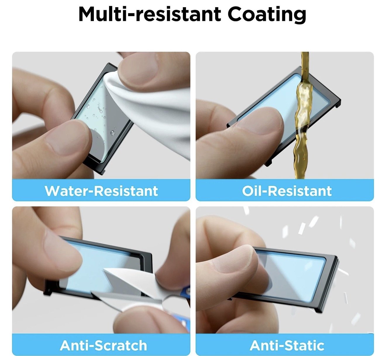 Multi-resistant coating, anti-scratch, anti-fingerprint, anti-static, oil-resistant and water-resistant.